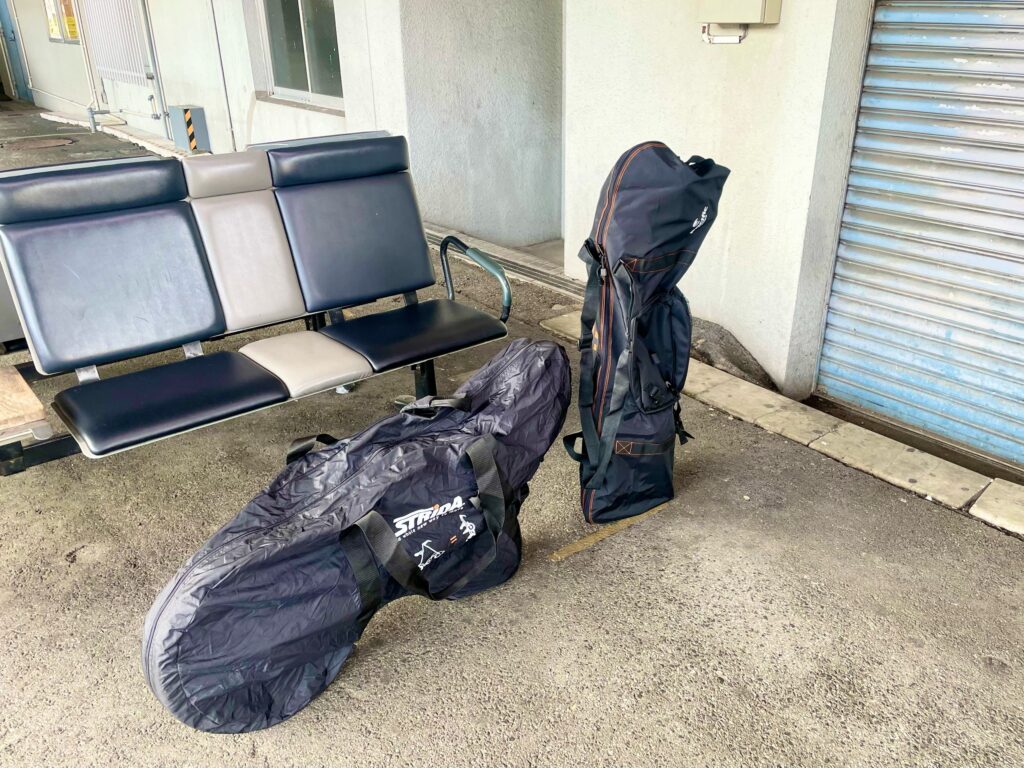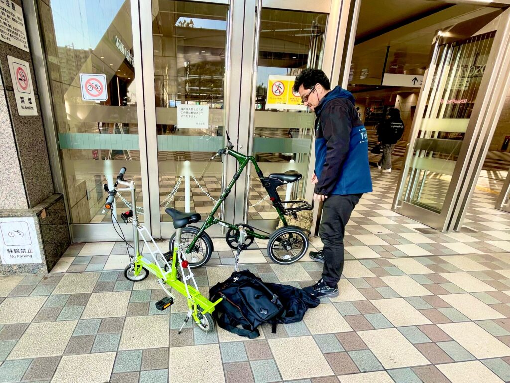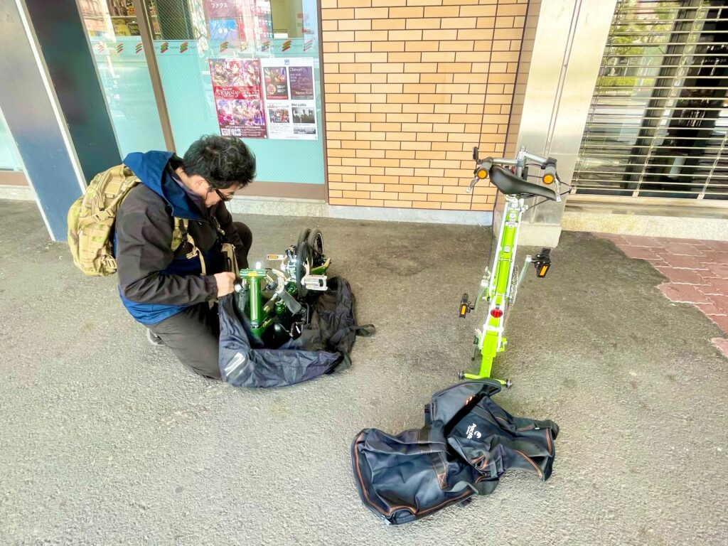 駅前で輪行袋に愛車を詰め込む